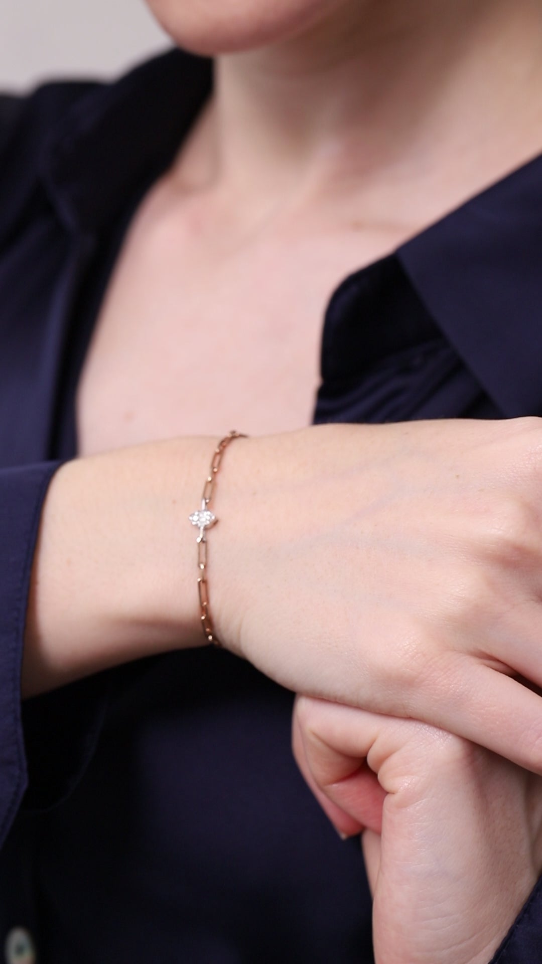 Descoperă rafinamentul brățării cu zale din aur roz 14K și diamant, o piesă sofisticată și elegantă. Cu un design minimalist și delicat, această brățară este creată pentru femeile care apreciază eleganța subtilă. Realizată din aur roz de înaltă calitate, brățara este decorată cu un diamant central care adaugă o notă de strălucire unică. Perfectă pentru a completa o ținută casual-chic sau pentru evenimente speciale, această bijuterie este un accesoriu versatil, ideal pentru orice ocazie.