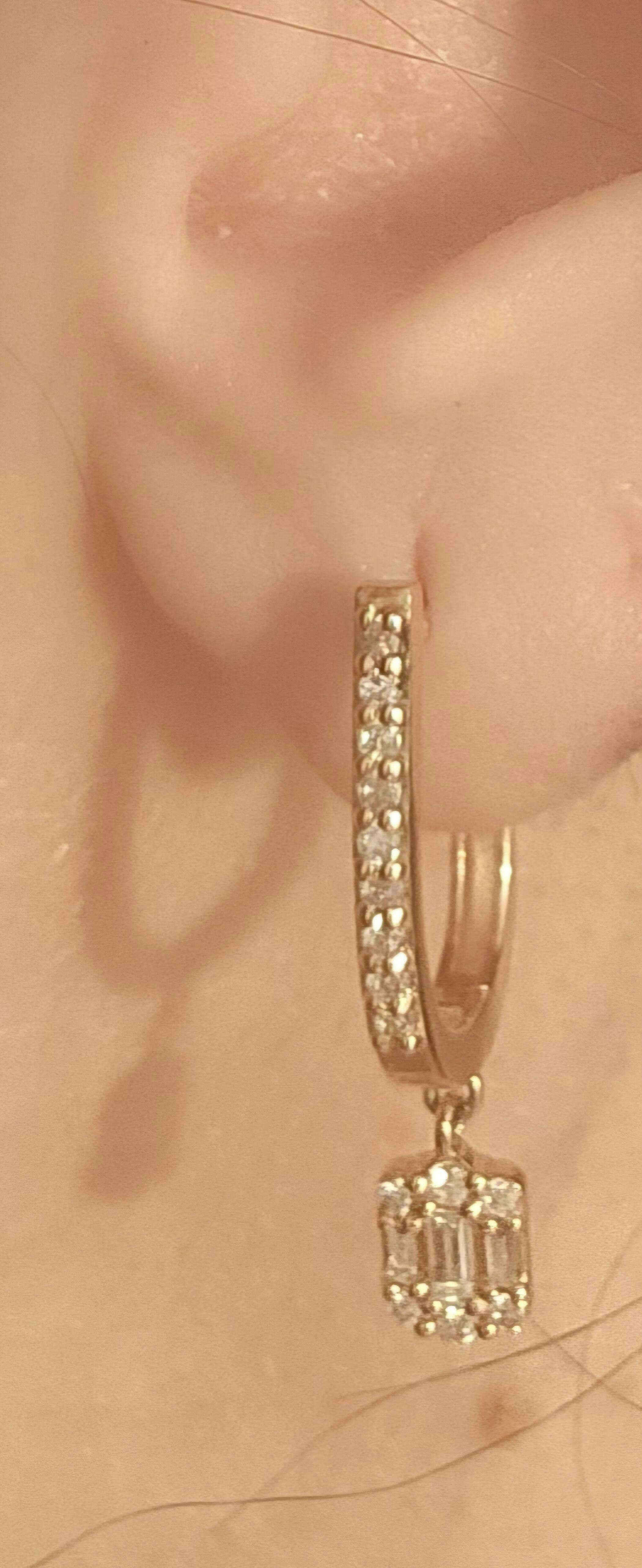 Un model ce îmbină delicatețea și strălucirea, acești cercei din aur roz de 14k impresionează prin designul lor rafinat și armonios. Decorați cu diamante naturale baguette si rotunde, montate atât pe cercurile fine, cât și pe pandantivele suspendate în formă dreptunghiulară, ei creează un joc elegant de lumini și reflexii. Versatili și sofisticați, acești cercei pot completa cu grație o ținută de zi, dar și una de seară, adăugând un plus de feminitate și stil. O bijuterie gândită pentru a însoți cu eleganță fiecare moment important.