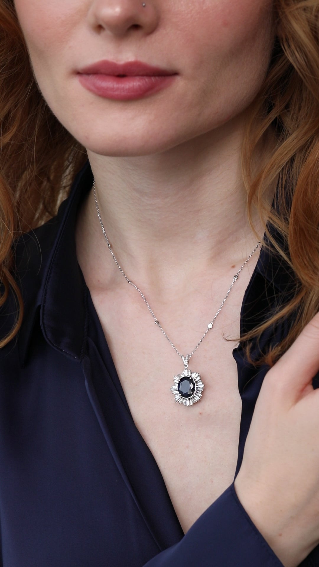 Colierul CN1055M este o declaratie magnifica de eleganta si stil. Combinand aurul alb cu diamantele stralucitoare montate de jur imprejurul safirului oval, aceasta bijuterie este o piesa de colectie care va completa orice tinuta, perfectă pentru ocazii speciale sau pentru momente cu totul unice din viața oricărei femei.