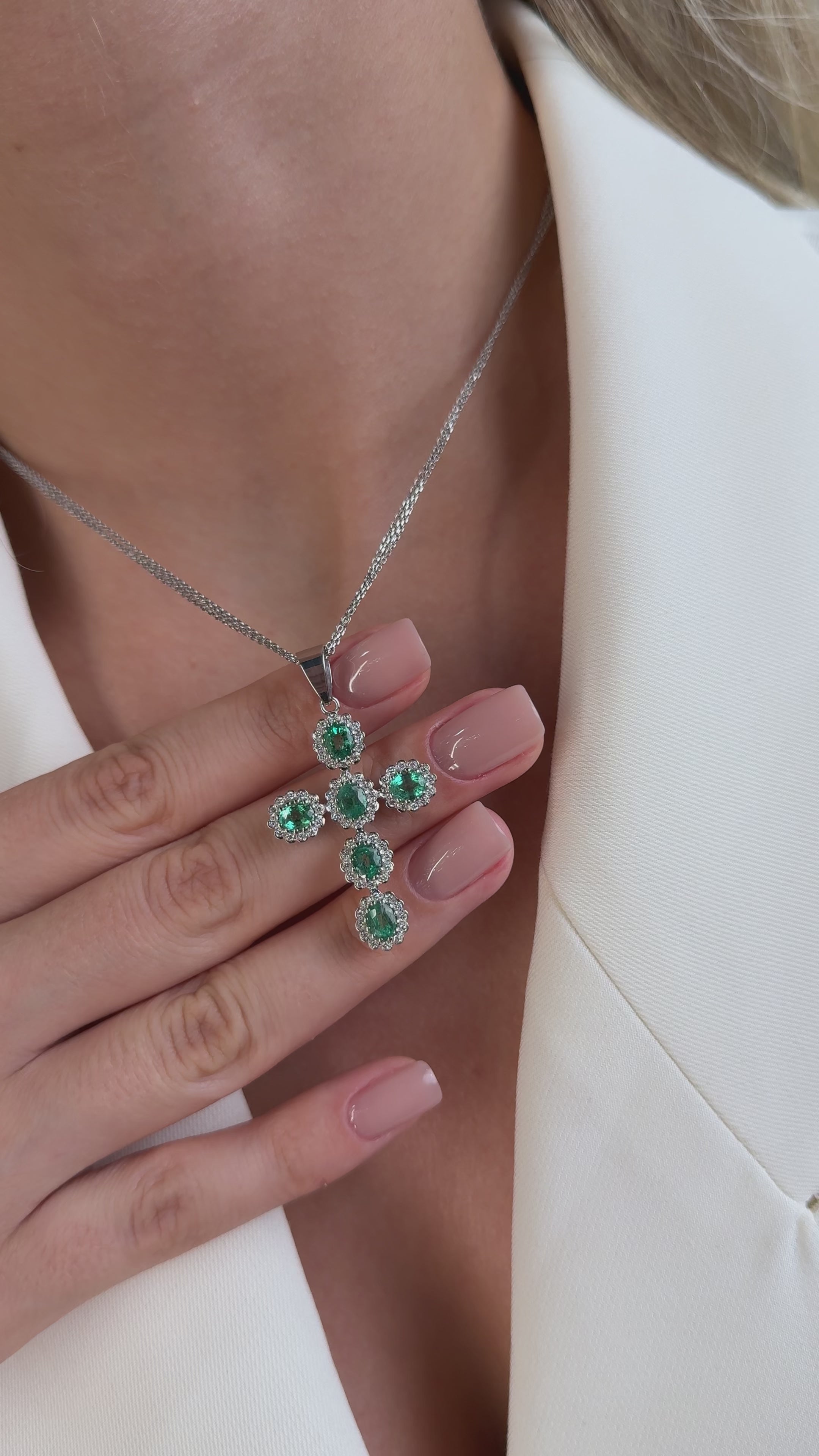 Un colier cruce spectaculos, realizat în atelierul La Rosa din aur alb de 18k, în care strălucirea diamantelor naturale întâlnește farmecul profund al smaraldelor. Designul este definit de o armonie impecabilă între proporții, lumină și culoare, rezultând o creație cu impact vizual puternic și simbolistică atemporală. Compoziția centrală prezintă smaralde ovale, cu greutatea totală de 2.36ct. Fiecare piatră prețioasă este înconjurată de un halo fin de diamante naturale, totalizând 0.39ct, care amplifică strălucirea și creează un efect radiant. Perfect pentru momente cu semnificație profundă, acest colier este realizat manual de maeștrii bijutieri La Rosa, cu o atenție desăvârșită pentru detalii și montură.