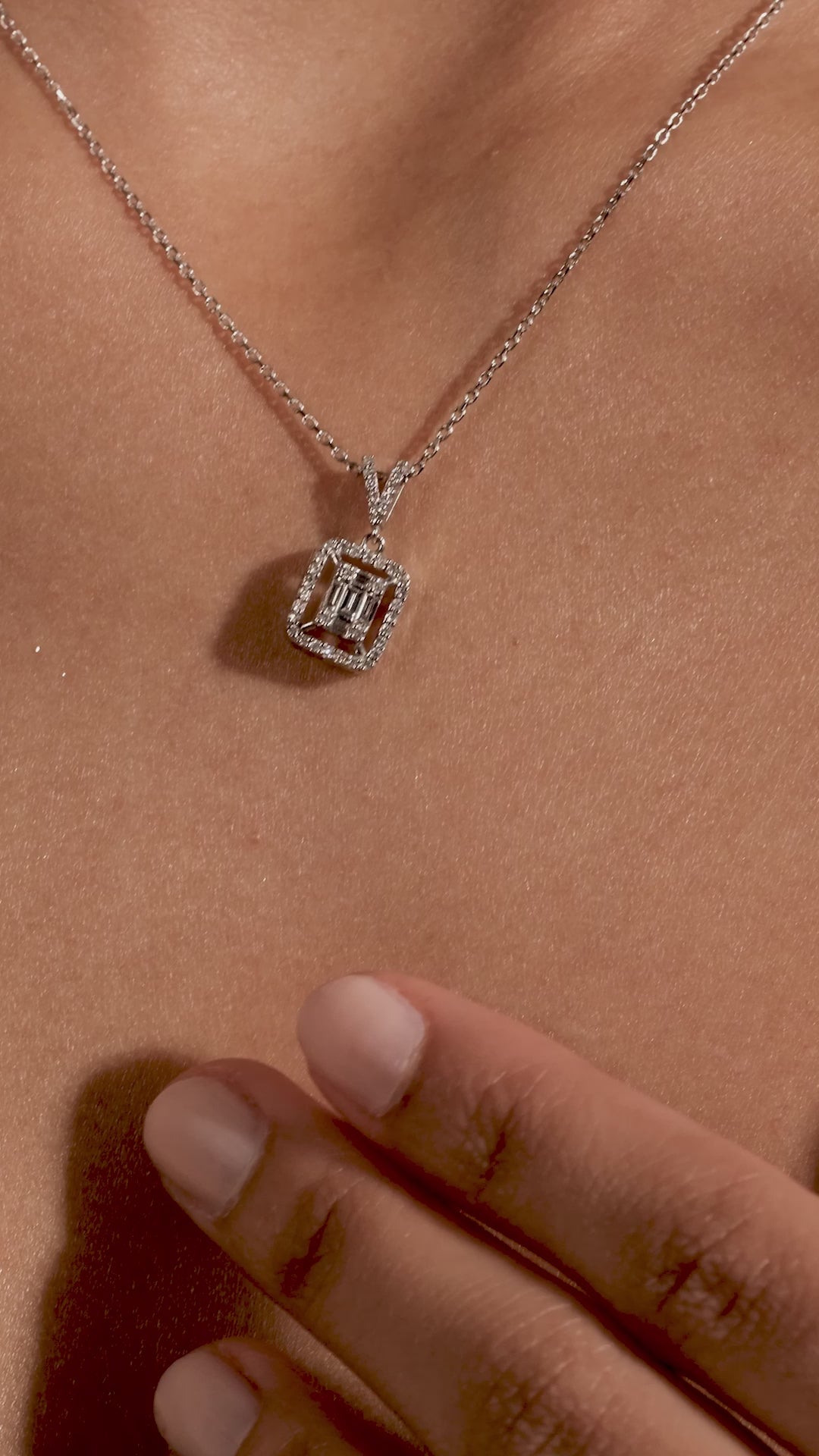 Confectionat din aur alb, colierul MD52446 reprezinta o alegere excelentă pentru ocazii speciale. Forma dreptunghiulara a pandantului ofera un detaliu sofisticat care adaugă o notă de lux și eleganță, îmbinând frumusețea clasică a diamantelor rotunde cu strălucirea și forma unică a diamantelor bagheta.