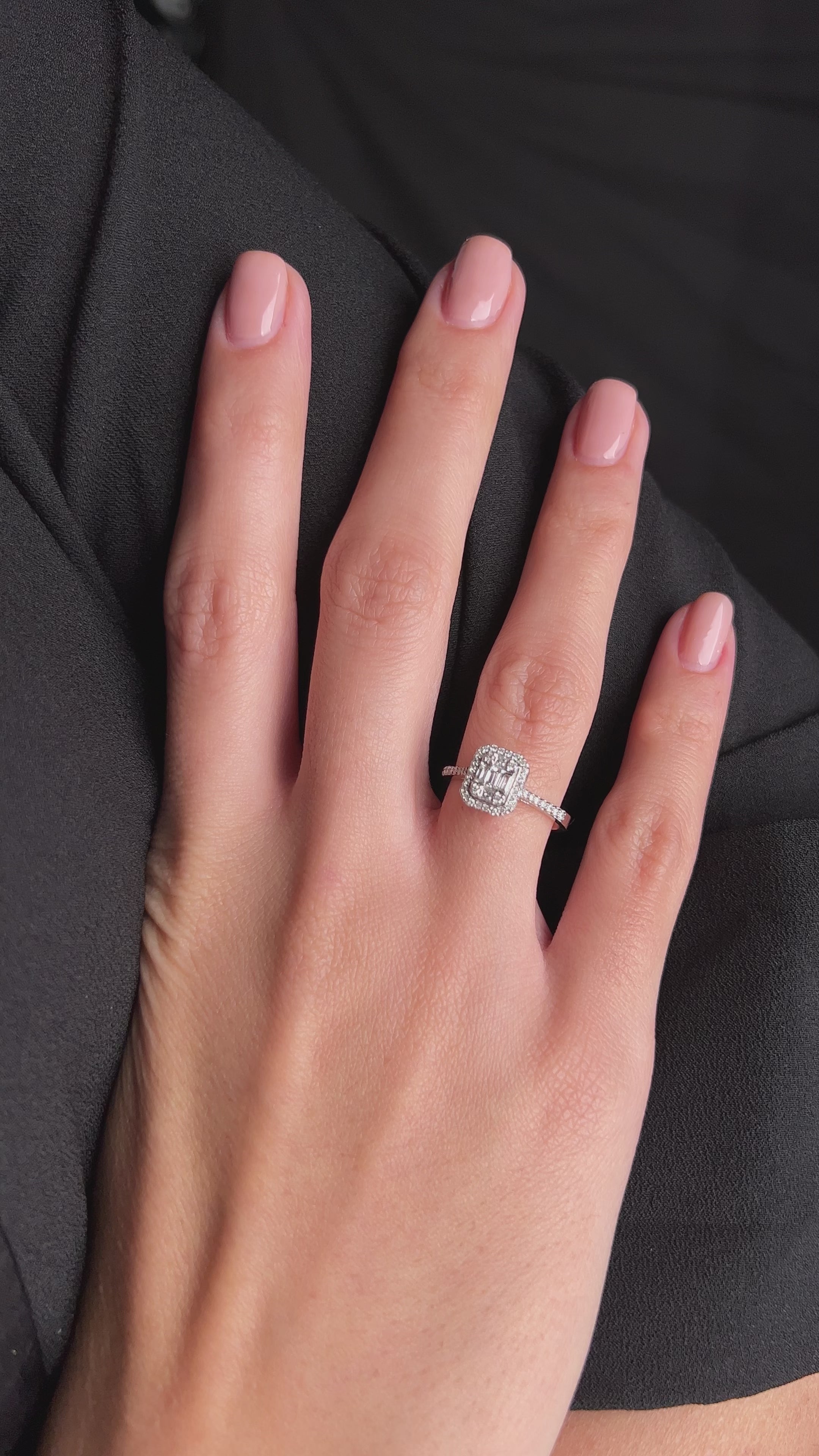 Un inel de logodnă elegant și modern, în care rafinamentul aurului alb de 14K se îmbină cu strălucirea subtilă a diamantelor baguette. Pietrele centrale sunt puse în valoare printr-o montură geometrică, evidențiată de un halo de diamante rotunde, ce adaugă profunzime și luminozitate. Brațul fin, împodobit la rândul său cu diamante, completează armonios designul, oferind bijuteriei un efect spectaculos și sofisticat. Un inel ce reflectă delicatețe, echilibru și eleganță atemporală, alegerea ideală pentru a celebra iubirea într-un mod distins și memorabil.
