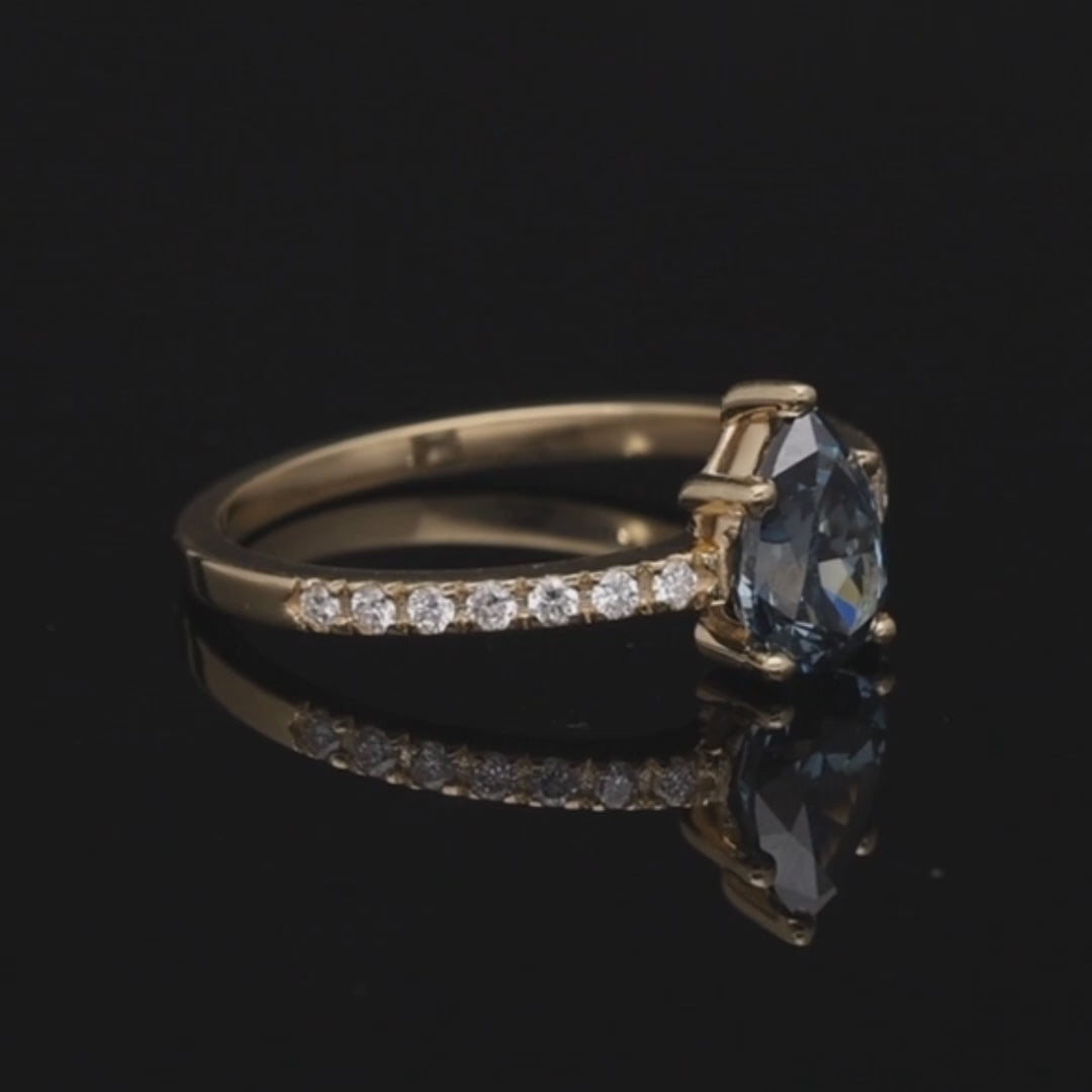 Un inel de logodnă care îmbină delicatețea aurului roz de 14K cu frumusețea rară a unui diamant albastru cultivat în laborator, tăiat în formă de pară. Cu o greutate de 1.05 carate și o claritate VS1, piatra centrală atrage privirile prin eleganța sa subtilă și nuanța de albastru intens. Diamantele laterale lab grown, perfect aliniate, completează designul cu o strălucire suplimentară și adaugă rafinament fiecărui detaliu.