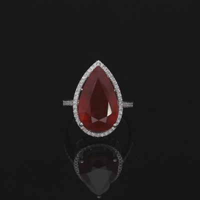 O bijuterie cu prezență impunătoare, acest inel din aur alb 18K pune în valoare un rubin natural spectaculos de 11.16ct, tăiat în formă de lacrimă. Culoarea sa roșu intens, profund și vibrant, captează imediat privirea și transformă piesa într-un adevărat simbol al pasiunii și rafinamentului. Halo-ul fin de diamante naturale adaugă strălucire și conturează elegant piatra centrală.