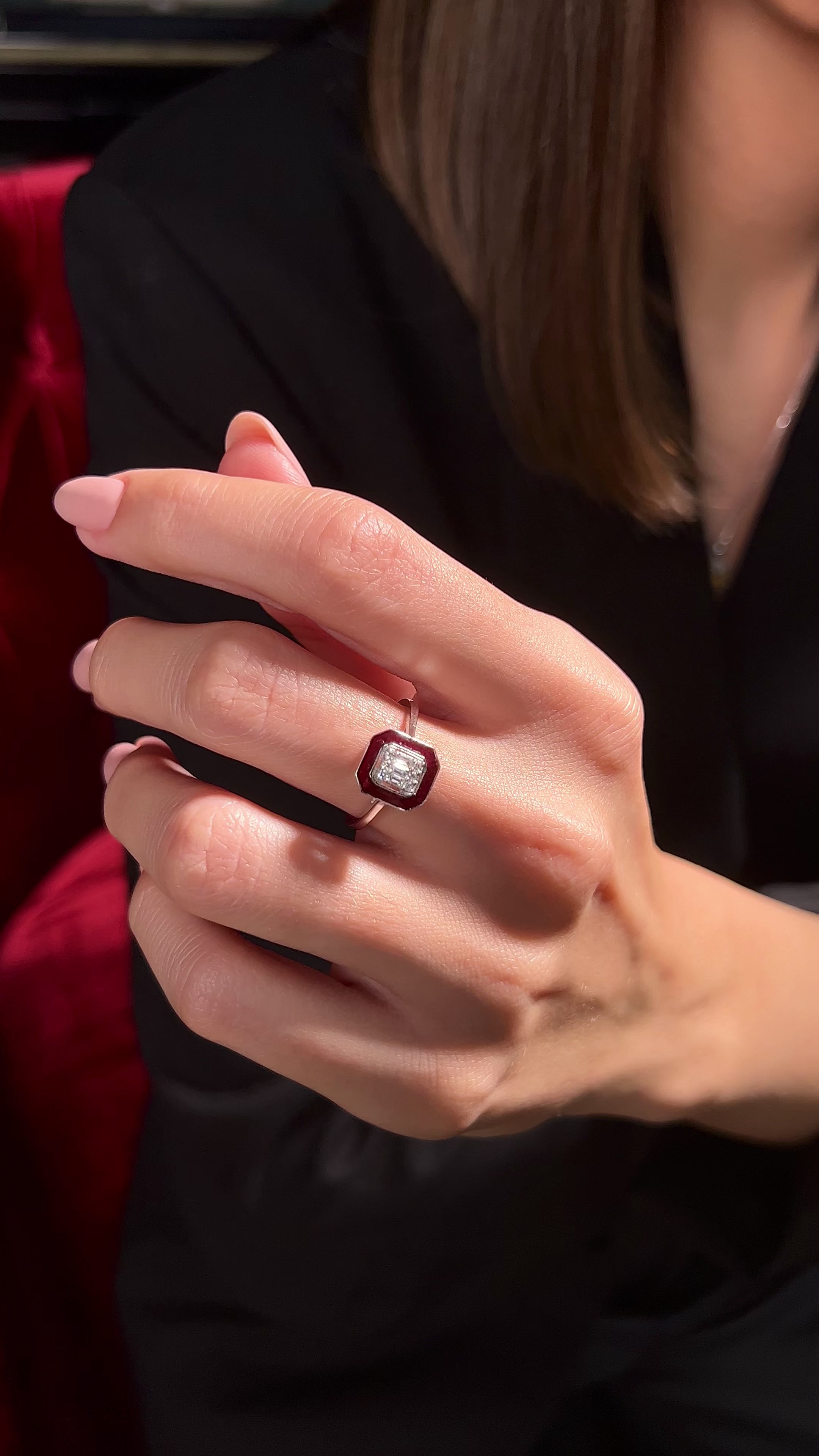 Inelul octagon din aur alb 14k cu diamante bagheta si email bordo face parte din Colectia Carnival