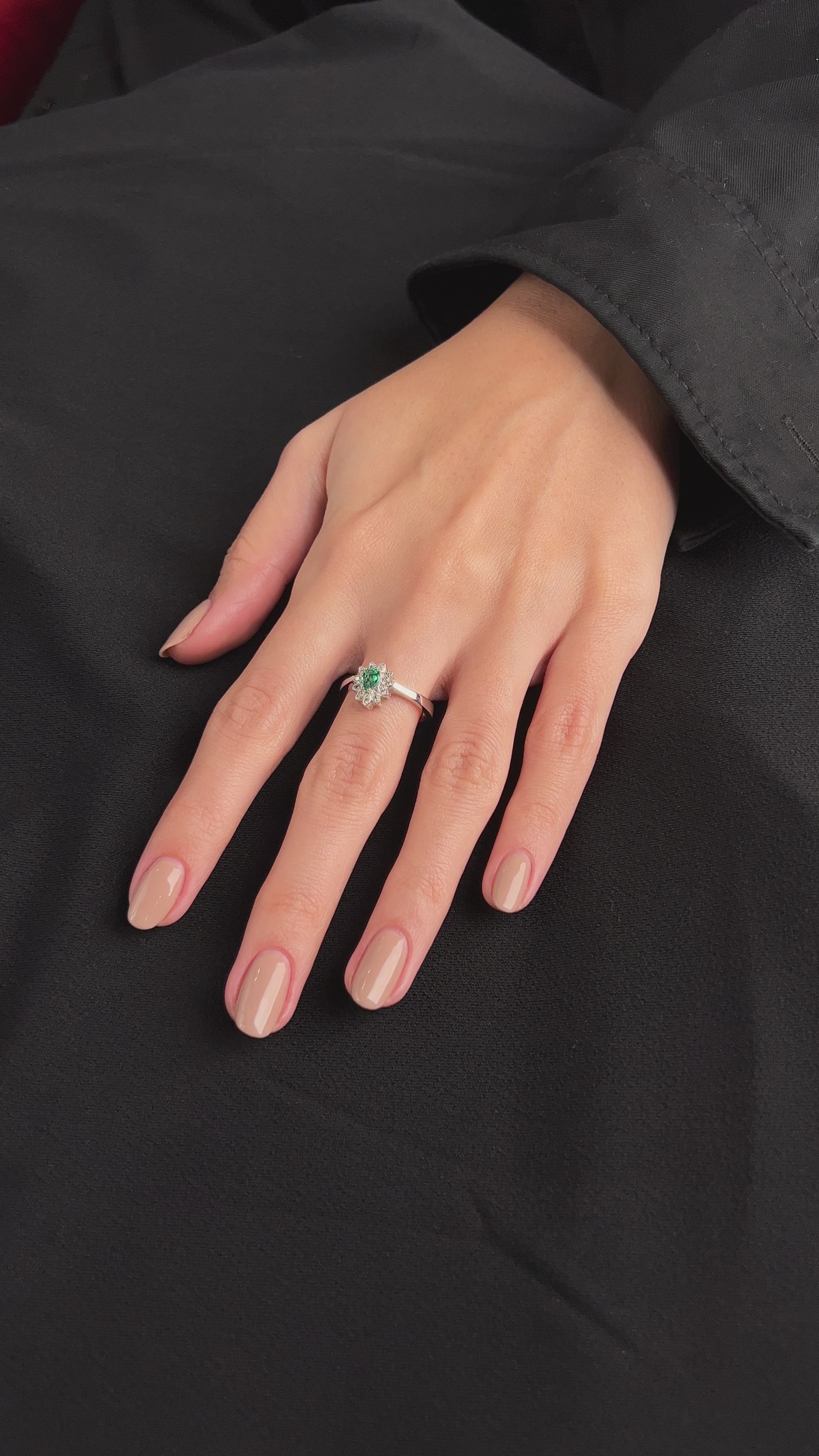 Inel R000124 din Aur Alb 14K Forma Floare cu Diamante Naturale Si Smarald