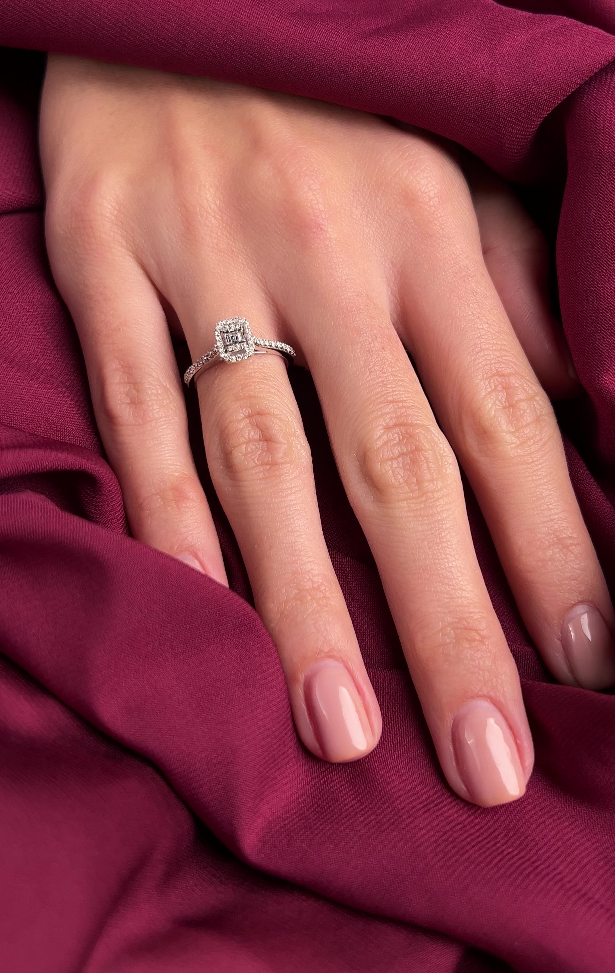 Inelul R000322 din aur alb de 14k cu diamante face parte din colectia Baguette.