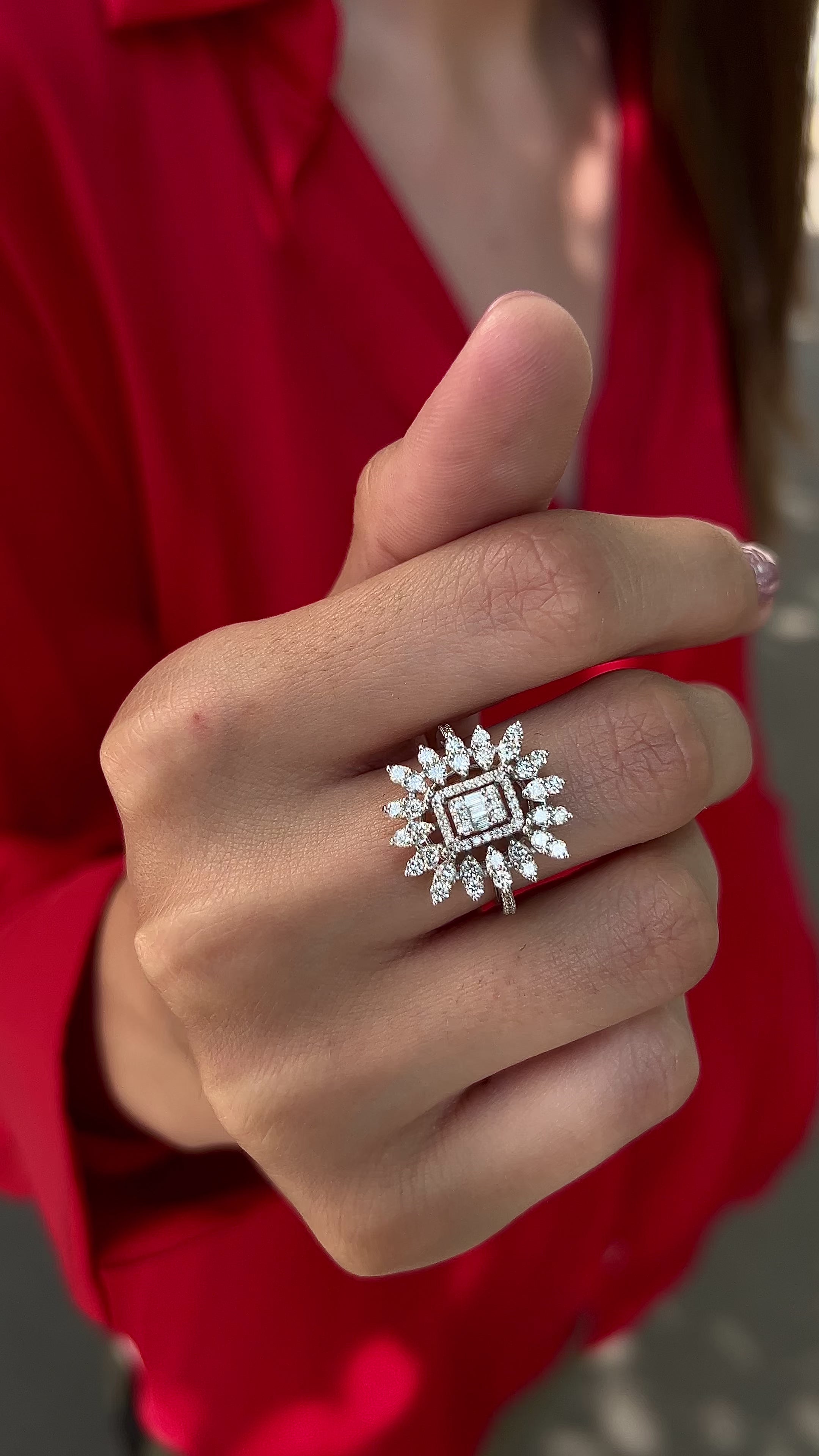 Inel R002679 din Aur Alb 14K Forma Floare cu Diamante Naturale