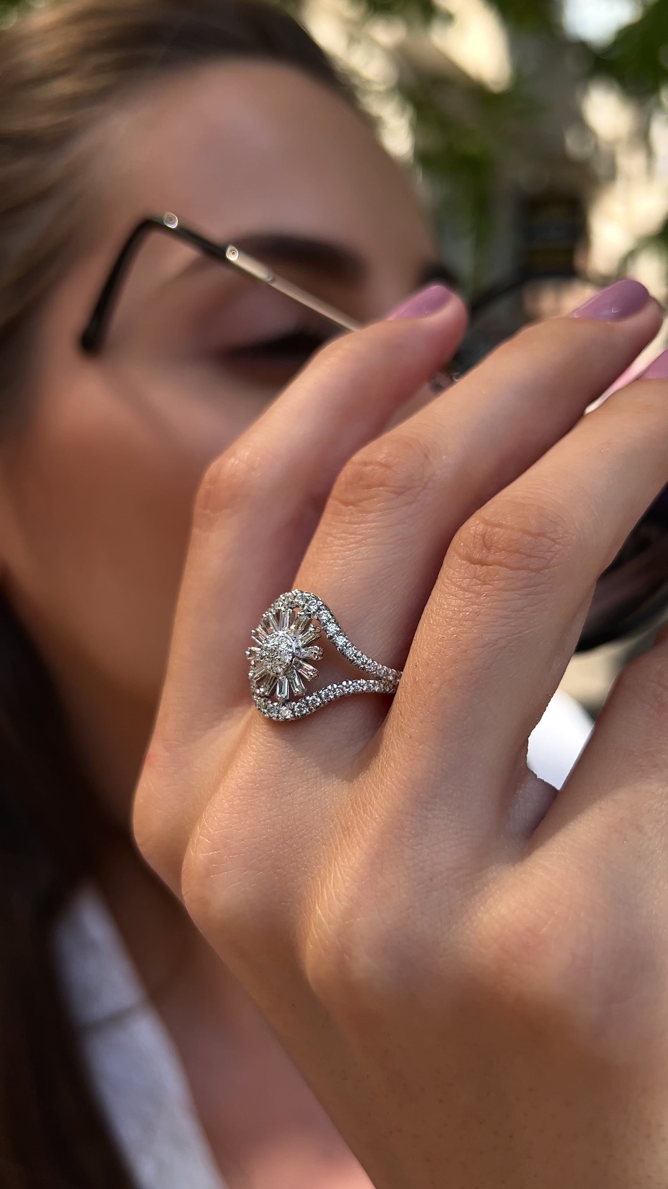 Inel R002941 din Aur Alb 14K Forma Floare cu Diamante Naturale