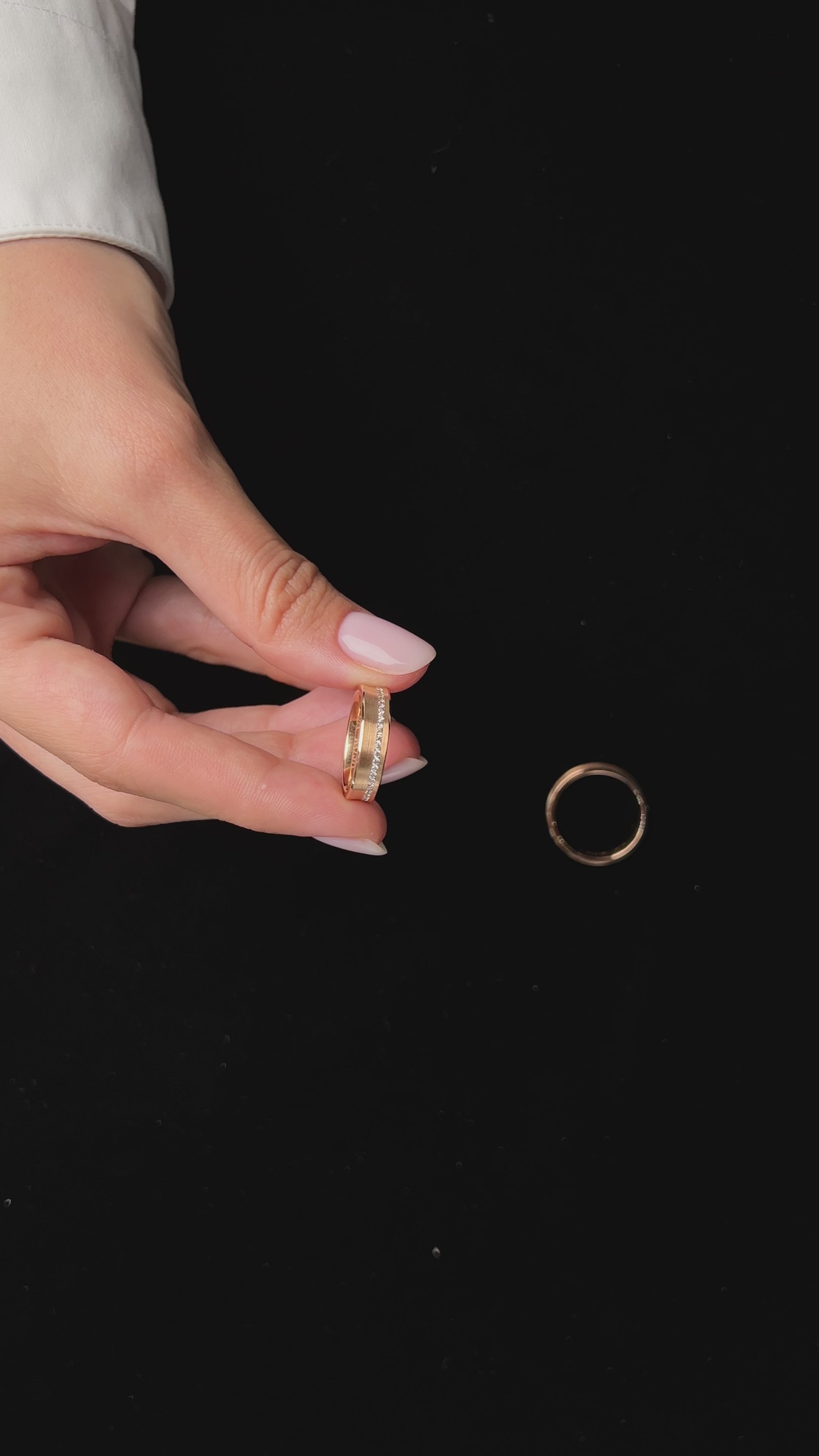 Verighetele Lrsz018 sunt o alegere elegantă și rafinată pentru cuplurile care doresc să-și declare iubirea și angajamentul. Aceste sunt realizate din aur roz, care le ofera un aspect cald si luxuriant, in timp ce diamantele montate în jurul întregii circumferințe a verighetei de dama, creaza un efect strălucitor și elegant.
