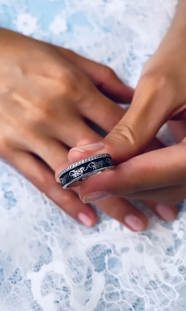 Modelul de verighete Murano din Colectia de verighete Manual este unul dintre cele mai apreciate bijuterii La Rosa. Acestea sunt realizate din aur alb si rodiu, iar in functie de preferinte pot fi decorate cu e sau diamante stralucitoare. Surprinzand prin motivul grafic al vitei de vie, transpus pe fond negru sub forma unei frumoase linii grafice in relief, modelul este destinat cuplurilor ce prefera o bijuterie de efect.